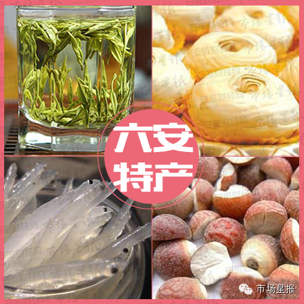 六安瓜片、舒城贡席、皖西白鹅、寿县“大救驾”、霍山石斛、漫水河百合、金寨山茶油、金寨茯苓、金寨将军菜、铜锣寨小吊米酒、霍邱芡实、廷龙瓜子、寿州粉皮、金龙玉珠(茶)、金寨红豆腐、胡店鸭蛋干、金寨灵芝、迎驾贡酒、霍邱柳编、金寨板栗、橡栗粉丝、六安酱鸭、舒城小兰花、霍邱银鱼、临水酒、霍山黄大茶、瓦埠湖银鱼、一品斋毛笔、霍山黄芽、八公山豆腐