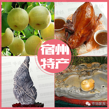 砀山酥梨、符离集烧鸡、灵璧石、夹沟香稻米、宿州乐石砚、萧县葡萄、皇藏峪蘑菇鸡