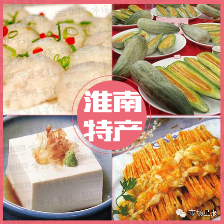 八公山豆腐、朱马店糯米、潘集酥瓜、淮南火烙画、顾桥双喜陈醋、夏集贡圆、淮南草席、上窑馓子、芦集绿豆圆