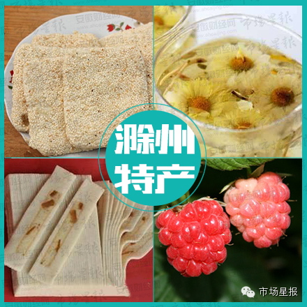 琅琊酥糖、马厂酥笏牌、施集茶叶、滁菊、滁州花篮、凤阳树莓、龙兴御液酒、碧绿春酒、明光甜叶菊、天长龙岗芡实、梅市咸水鹅、定远老鹅肉、定远花生、卤兔子、“睡莲”棉被胎、管坝牛肉、来安春卷、雷官板鸭、京彩松花皮蛋、凤画、梅白鱼、池河雪片糕、日月牌粉丝、花红果、来安麻鸭、凤画、酿豆腐、花园湖大闸蟹、秦栏卤鹅、甘露饼、酥烧饼、高邮湖大闸蟹、明光绿豆、老明光酒、淮王鱼、银鱼、女山湖大闸蟹