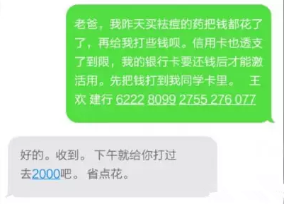 姜丽是个大二的学生,同样的也参与过这类关注群发领奖励的活动。在参与后的半个月,姜丽的爸爸收到了“姜丽”发来的短信,短信内容是这样的: