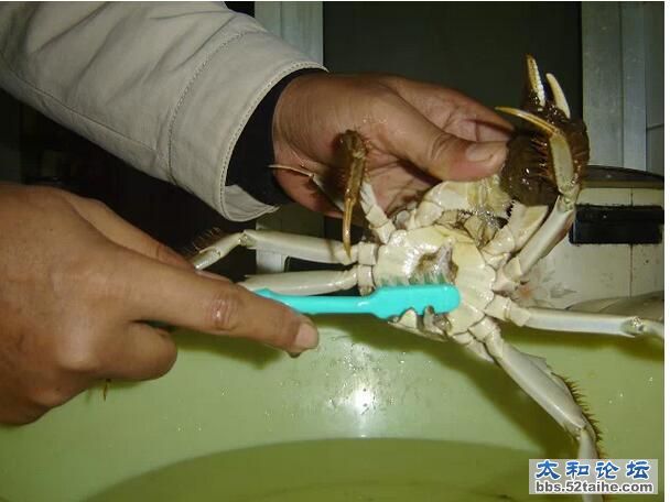 5.将螃蟹置于阳光或灯光下背光观察,透过阳光,蟹盖边缘不透光的则说明螃蟹肥满,若透亮缝隙可见,则螃蟹比较空。 洗怎么洗螃蟹1、首先准备半盆清水和一把旧牙刷。 2、放入要清洗的螃蟹,不要担心螃蟹会到处乱跑,它会钻进水里。有个别螃蟹会跑出来,把它抓住或赶进水里就行了,一会就安静了。浸泡十分钟左右就可清洗了。 3、抓住螃蟹的两边,用牙刷用力清洗背、腹和嘴部。然后清洗螃蟹的两侧及脚和钳的根部。 4、这里是最关键的一步,胆子小了可不行。抓住双钳(用牙刷柄从下向上挑起双钳的关节处,用抓蟹的拇指和食指顺势沿钳根向上用力抓住蟹钳。个别凶猛的螃蟹可先向下压几下钳子或敲打几下)打开腹盖,在中间从里向外挤出排泄物。 5、清洗螃蟹的腹盖内的脏物及蟹钳,这样螃蟹算是清洗完成了。 6、将清洗完成的螃蟹放入有大半锅清水的锅内,(不放水的话螃蟹会乱跑的)全部洗完后加满清水浸泡约十分钟再冲洗,目的是清洗掉洗螃蟹时带入的脏水。 小贴士: 如果怕螃蟹夹手,先准备一盆约45度的热水,也就是手放入水中不感到烫就行(太烫了螃蟹的脚会脱掉)。将螃蟹肚子朝上逐一放入水中,等它翻过来时就已经喝了热水呛晕了。 这样做的好处是螃蟹只是晕了过去,任你摆布不会再夹你的手指了,并且也不会影响螃蟹的鲜美。然后再按清洗步骤过行。 做怎么做螃蟹好吃像螃蟹这类海鲜,煮和蒸是最能保持它原本海鲜的鲜味的吃法了,原汁原味的蟹香四溢,口感太棒了。