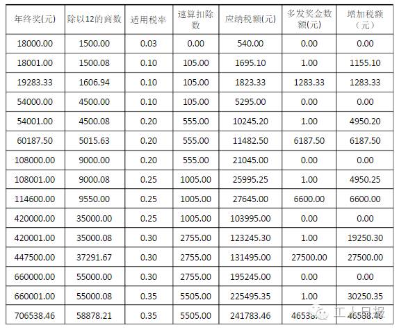 方法三:年终奖金与双薪同一个月内发放时,将所发的双薪与年终奖金合并除以12个月,找出对应税率,(双薪+年终奖)/12×税率-速算扣除数。