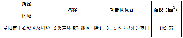 本次调整后的声环境功能区涵盖2020年阜阳市中心城区、西湖风景区、阜阳合肥现代产业园,共214.91平方公里。其中,无0类声环境功能区,1类声环境功能区面积11.72平方公里,2类声环境功能区面积102.57平方公里,3类声环境功能区面积34.87平方公里,4类声环境功能区面积65.75平方公里。