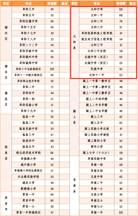 一、2022年阜阳市中考(九年级)考点考场安排