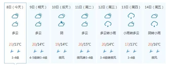 来自阜阳气象台预报,今天下午到夜里:多云间晴;偏北风4级左右,阵风6-3级;今天最高气温:23~25℃;明晨最低气温:13~15℃;预计:10月9日,多云间晴。