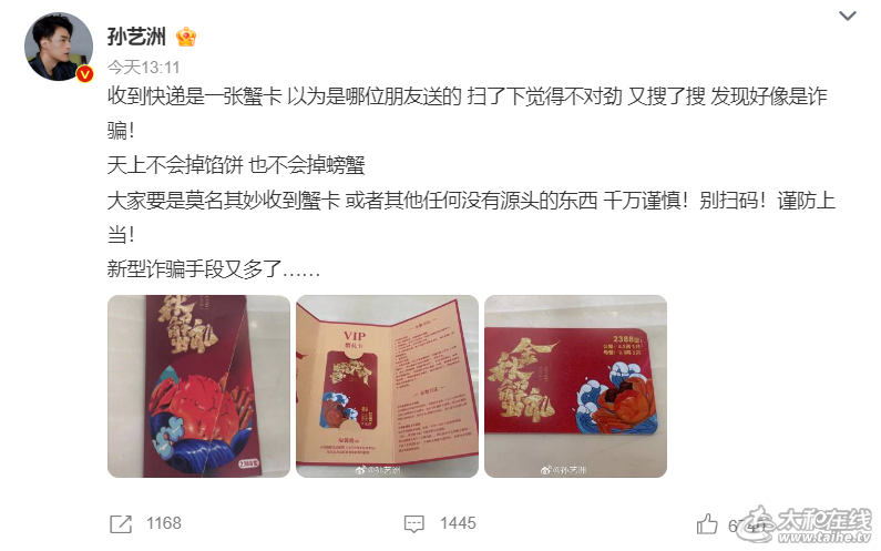10月7日,演员@孙艺洲 发文称:收到快递是一张蟹卡,以为是哪位朋友送的,扫了下觉得不对劲,又搜了搜,发现好像是诈骗!天上不会掉馅饼,也不会掉螃蟹,大家要是莫名其妙收到蟹卡,或者其他任何没有源头的东西,千万谨慎!别扫码!谨防上当!